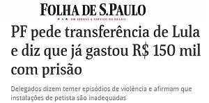 Nosso comentário: A divulgação desse valor constituiu mais uma agressão do Estado ao ex-presidente Lula. Ora, o que Lula tem a ver com esse gasto? A PF tem feito operações sensacionais há tempos, que se intensificaram muito a partir da Lava Jato. A notícia é mais um capítulo no incentivo ao ódio político, porque visa transferir a Lula, preso político, a culpa pelos gastos com sua prisão, gerando intolerância e sectarismo. Provavelmente, fascistas usaram a informação para defender a morte do ex-presidente, alegando os altos custos de sua prisão. Ora, as manifestações em defesa de Lula são grandes e crescentes porque sua prisão é injusta! A grande imprensa, ao esconder as avaliações imparciais de juristas, políticos e intelectuais do mundo inteiro, sobre a prisão de Lula, manipula a opinião pública, que não entende porque há tanta insatisfação com a prisão do ex-presidente. A responsabilidade da mídia e da PF pelo avanço do fascismo é cada vez maior.