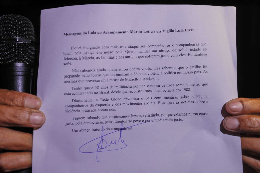 Expresso aqui meu veemente repúdio ao ato terrorista praticado na madrugada de sábado contra o acampamento, ao mesmo tempo que expresso minha irrestrita solidariedade aos bravos companheiros que continuam, com risco de sua integridade física, a defender a liberdade do Presidente Lula e seu direito de candidatar-se. O fascismo não passará.