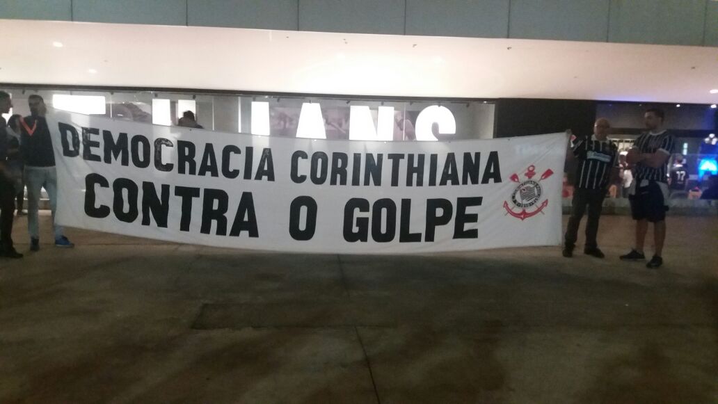 Na chegada a Arena Corinthians, torcedores que entram pelo estacionamento da Radial Leste se depararam com a faixa: “Democracia Corintiana, Contra o Golpe”.