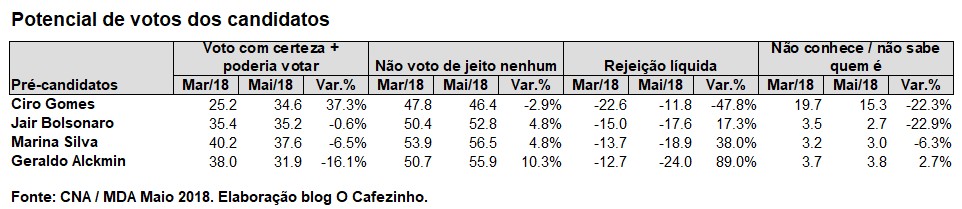 Na coluna “rejeição líquida”, que desconta o nível de aprovação, os números não deixam dúvida: enquanto a rejeição líquida de Alckmin cresceu 89%, a de Ciro Gomes despencou quase 50%. Bolsonaro e Marina também viram uma alta muito forte de suas respectivas rejeições líquidas.