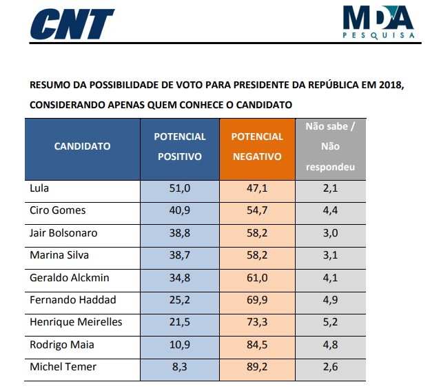 Atualização: na mesma pesquisa, constam Lula (51%) e Ciro Gomes (41%) como os candidatos com maior potencial de votos e as menores avaliações negativas. Bolsonaro está em terceiro lugar.