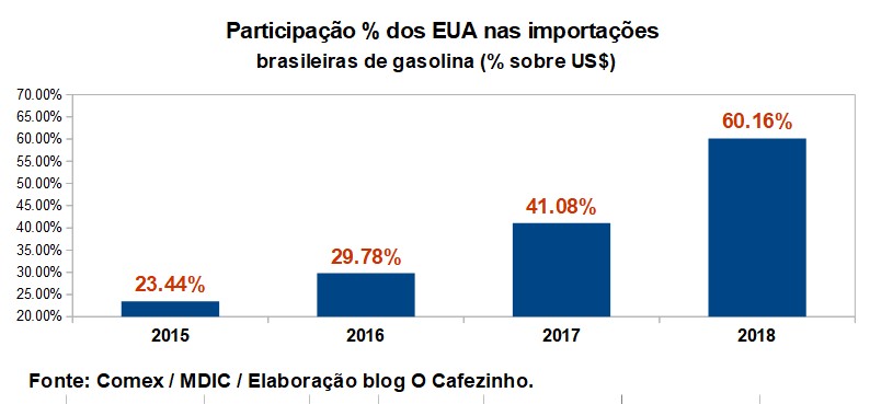 Os EUA também ampliaram o seu domínio sobre o mercado de gasolina no país. Antes do golpe de 2016, os EUA respondiam por uma média de 20% a 25% das importações brasileiras de gasolina.