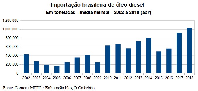 Em quantidade, a importação de óleo diesel tem batido recorde no país: em 2017, importamos 11 milhões de toneladas de óleo diesel, maior volume da história. No acumulado dos 4 meses de 2018, a importação mensal média de óleo diesel ficou em mais de 1 milhão de toneladas, mais um recorde histórico.