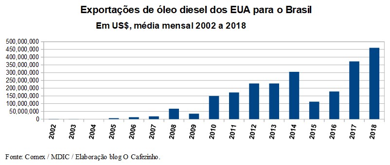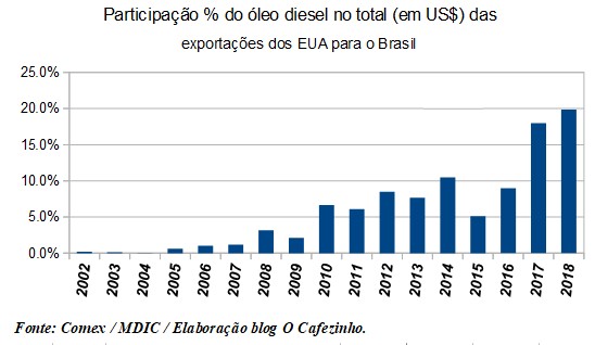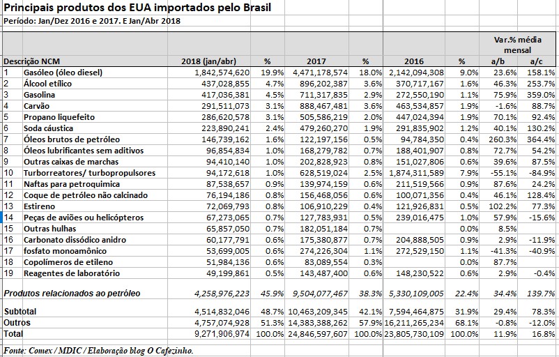 Apenas o óleo diesel, respondeu por 19% das exportações americanas para o Brasil em Jan/Abr 2018. Em 2016, o óleo diesel respondia por apenas 9% das exportações americanas para o Brasil.