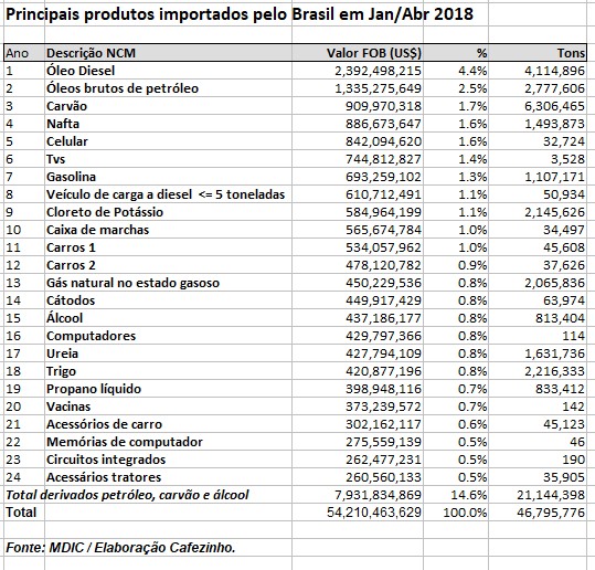 Quase metade dos produtos americanos exportados para o Brasil tem alguma relação com petróleo ou com o mercado de combustível. Refiro-me a oleo diesel, álcool, gasolina, carvão, propano, soda cáustica, óleo bruto, lubrificantes, nafta, coque de petróleo, estireno, hulhas (carvão), copolímeros…