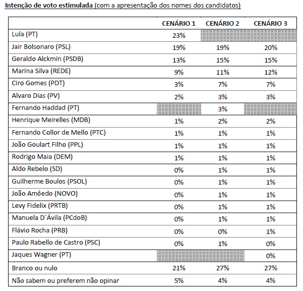 Lembrando que as candidaturas não estão oficialmente definidas e, portanto, os cenários testados consideram prováveis nomes para a disputa. Além disso, não é possível comparar os resultados com os do levantamento anterior, uma vez que foi incluído um novo pré-candidato.