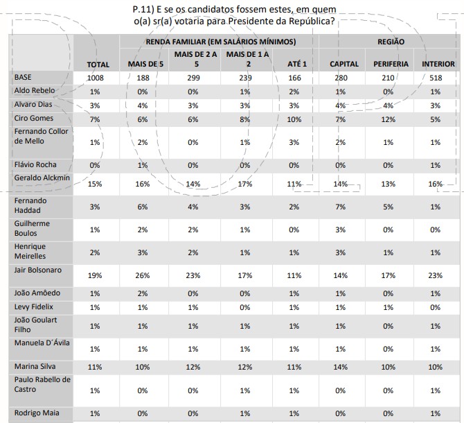 Olhando os votos entre os mais pobres, que ganham até 1 salário, onde o lulismo tem mais força, os principais candidatos se embolam em primeiro lugar: Alckmin, Bolsonaro, Marina e Ciro estão rigorosamente empatados, com 10% a 11%.