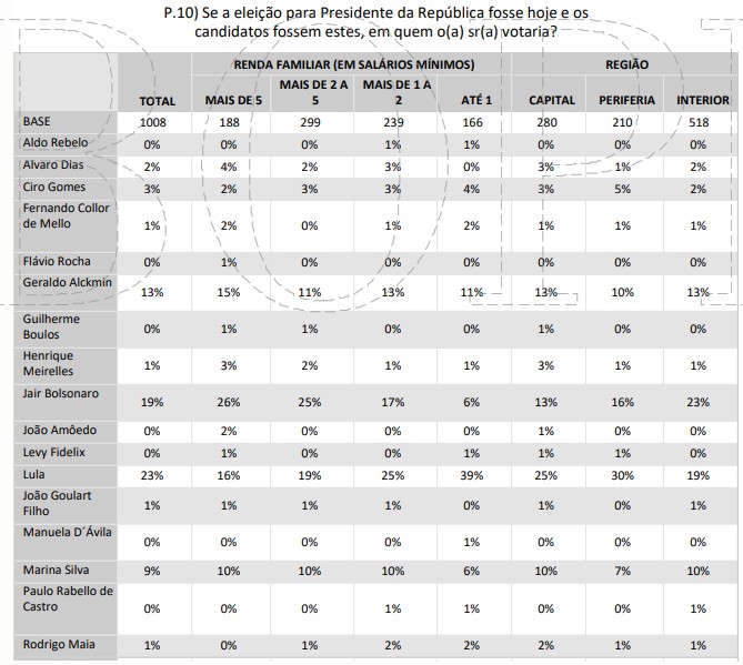 Entre quem ganha até 1 salário, Lula tem 39% dos votos, contra 6% de Bolsonaro. Entre quem ganha 1 a 2, o petista cai para 25% e Bolsonaro sobe para 17%. Entre quem ganha de 2 a 5 salários, Lula cai para 19% e Bolsonaro dispara para 25%. Entre  quem ganha mais de 5 salários, o eleitorado lulista desaba para 16% enquanto o de Bolsonaro vai a 26%.