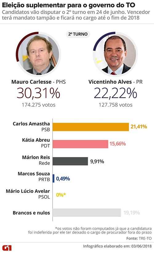 O segundo turno será disputado por dois políticos de centro-direita e direita: o PHS de Mauro Carlesse é qualificado pelo wikipédia de “centro-direita”. Apoiou Lula em 2002 e Marina Silva em 2014. Seus deputados votaram em favor do impeachment. O senador Vicentinho Alves, do PR, é um aliado do governo Temer, que votou pelo impeachment.