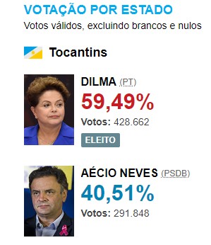 Em 2014, a presidenta Dilma Rousseff obteve uma vitória folgada em Tocantins, tanto no primeiro quanto no segundo turnos.