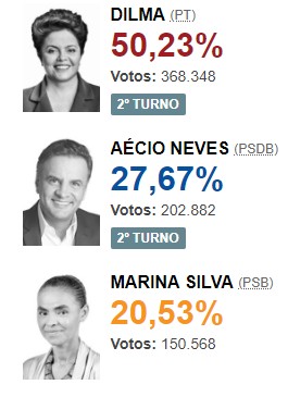 Dilma Rousseff (PT) foi a candidata mais bem votada no primeiro turno, com 50,24% dos votos válidos, e ganhou no segundo turno, com 59%. Aécio marcou 28% no 1º turno e 40% no segundo.