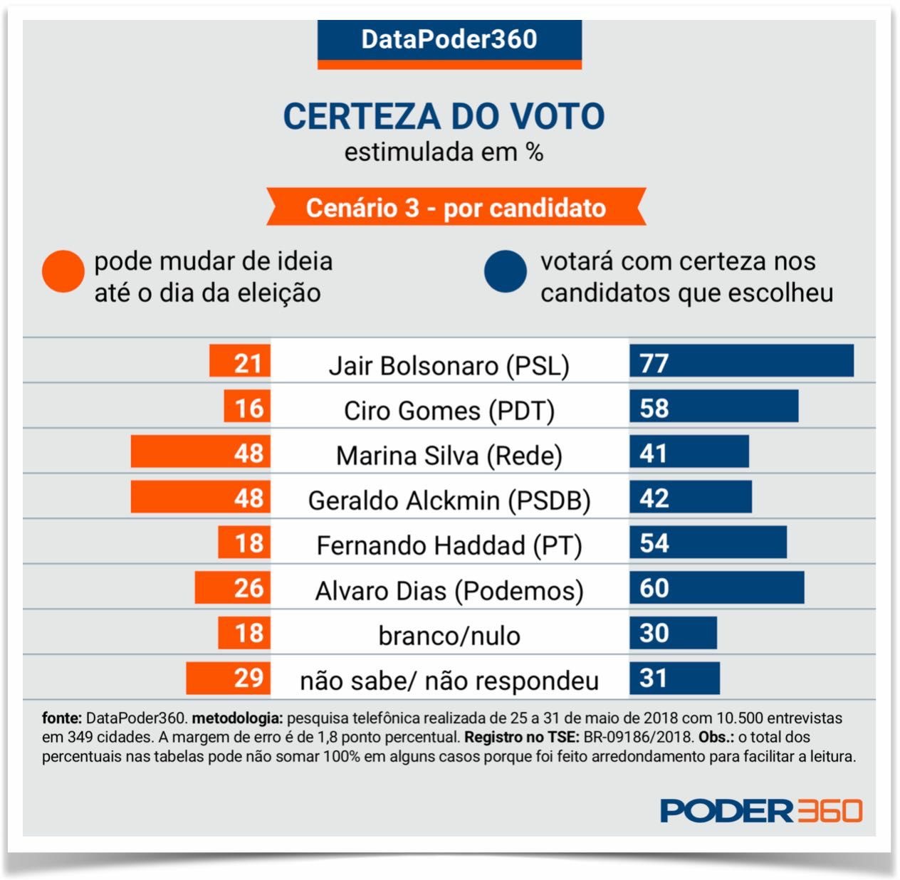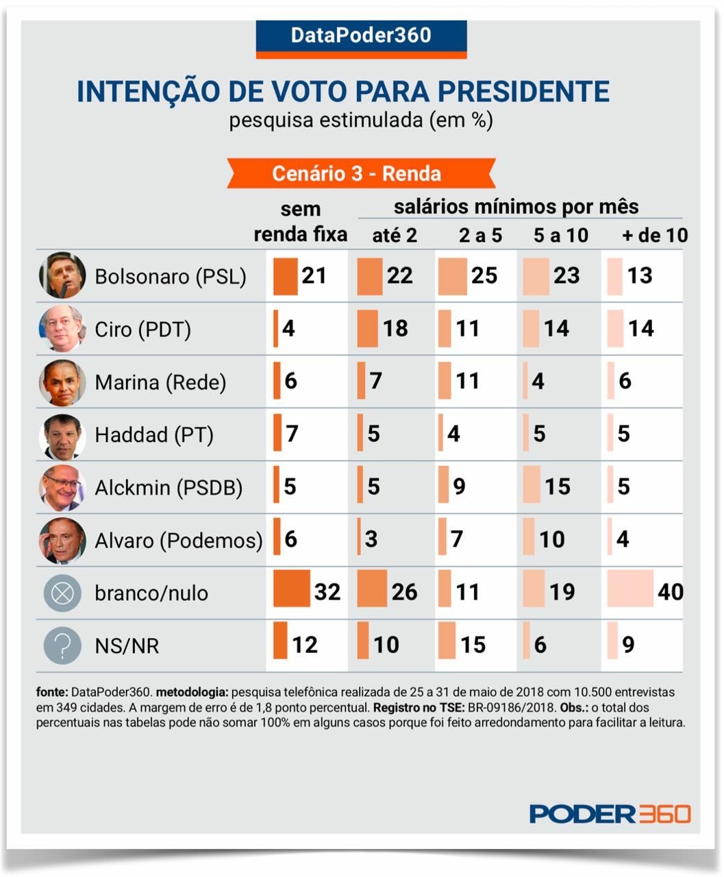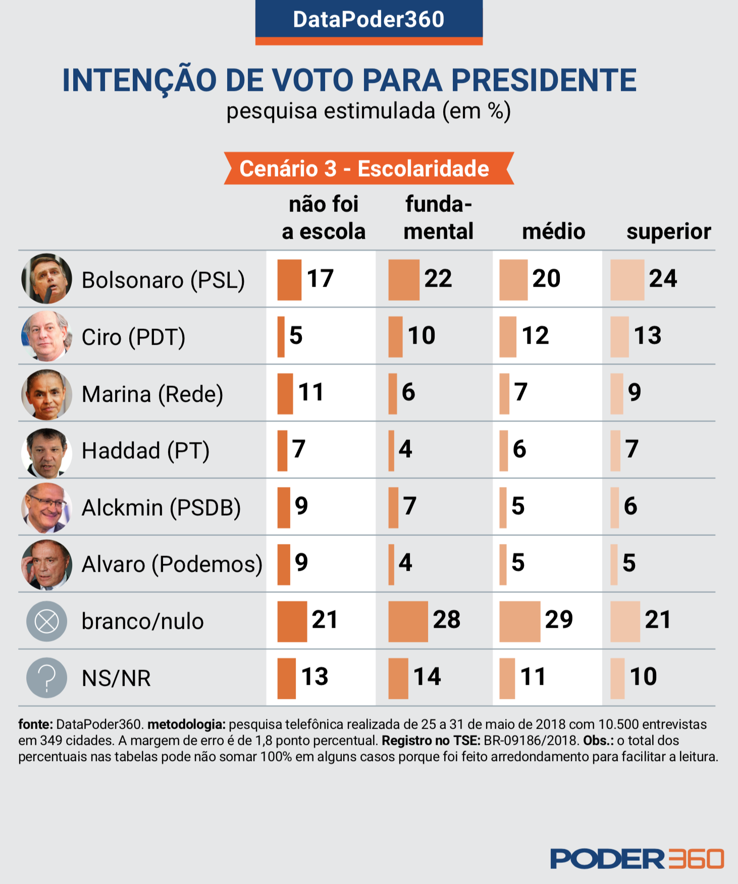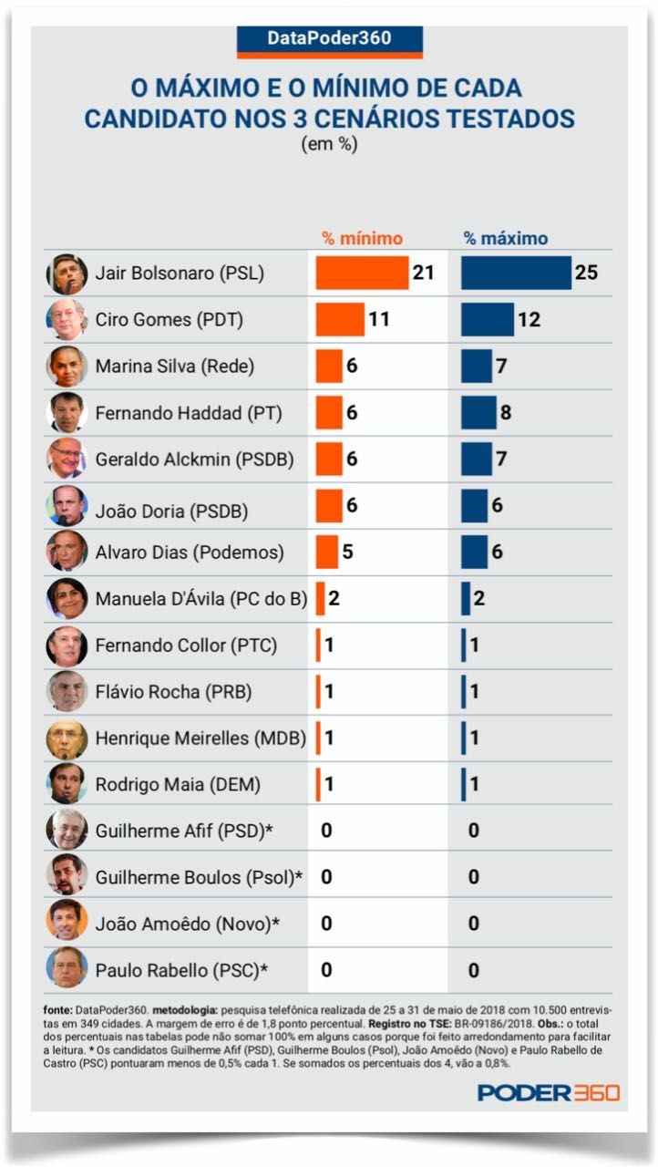 Houve, portanto, alta de 3 pontos de Bolsonaro, 4 pontos de Ciro, oscilação positiva de 1 ponto para Haddad e Alckmin, e queda de 2 pontos de Marina. Em abril, Joaquim Barbosa pontuava 16%, mas o ex-ministro do STF desistiu de disputar.