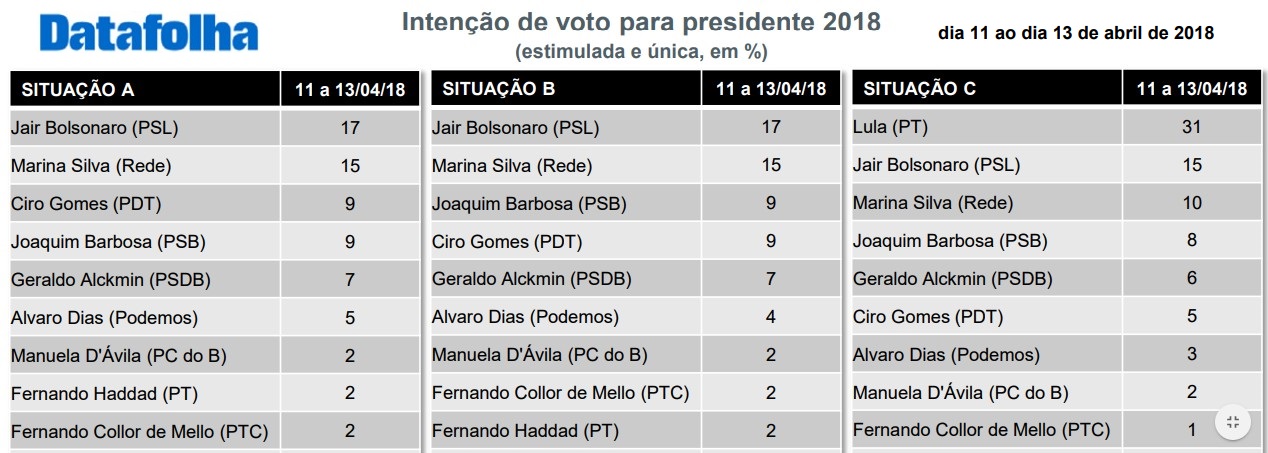 Segundo este último Datafolha, com entrevistas realizadas entre os dias 11 e 13 de abril, uma semana depois da prisão do ex-presidente, o quadro de intenções de voto era o seguinte (com Lula e sem Lula):