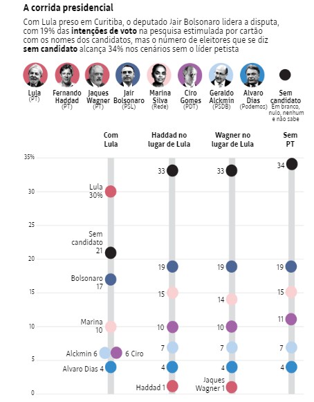 No cenário sem nenhum petista no páreo, Bolsonaro marca 19 pontos, 2 pontos acima da pesquisa anterior, Marina cai um ponto e Ciro Gomes oscila 2 pontos para cima, para 11%.