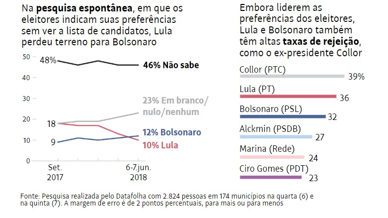 Lula continua à frente, com 30% dos votos (tinha 31% na pesquisa anterior). Bolsonaro, por sua vez, avança dois pontos, e atinge 17 pontos. Alckmin fica parado em 6%. Ciro oscila 1 ponto para cima e fica com 6 pontos. Marina fica com 10 pontos.