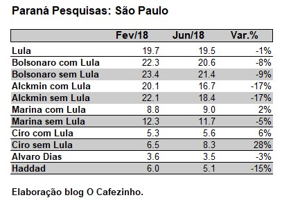A conclusão é que o eleitorado do Alckimin migrou para “nenhum”, Haddad caiu, Marina mantém certa estabilidade, Ciro subiu um pouco, Álvaro está estável, Bolsonaro caiu um pouco e Lula é imbatível.
