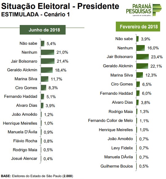 Já os principais candidatos conservadores, Bolsonaro e Alckmin caíram, em especial o tucano. Bolsonaro caiu de 23% em fevereiro para 21%, no cenário sem Lula, e de 22% a 20% num cenário com Lula.