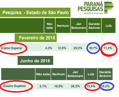 Lula, por sua vez, se mantém firme com seus 19.5%, exatamente o mesmo percentual de fevereiro. O petista avança em alguns segmentos relevantes, sobretudo para uma região como São Paulo. Por exemplo, Lula ganhou dois pontos entre eleitores paulistas com ensino superior: tinha 11% em fevereiro e agora tem 13%.