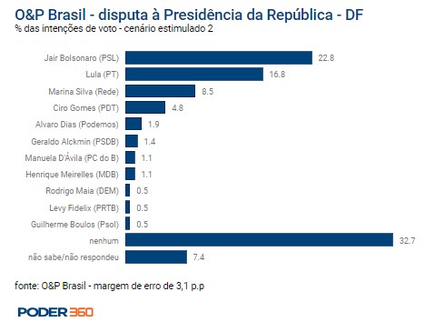 Pesquisa feita pelo instituto O&P, entre os dias 3 e 5 de junho, mostram que Bolsonaro se mantém na liderança de intenção de votos no Distrito Federal, inclusive em cenários com a presença de Lula.