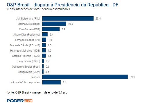 Sem Lula, Bolsonaro lidera isolado com 23%, e Marina e Ciro Gomes, empatados tecnicamente (a margem de erro da pesquisa é de 3 pontos), disputam uma vaga no 2º turno.