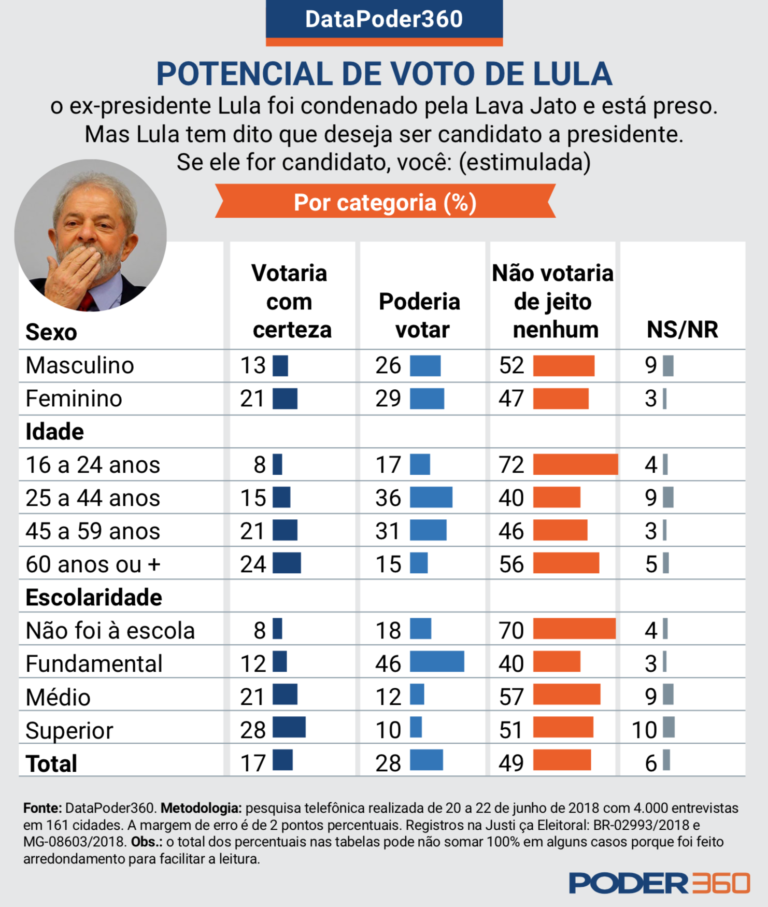 “A pesquisa mostra que 17% dos entrevistados votariam com certeza em Lula. Outros 28% dizem que poderiam votar. Outros 49% dizem que “não votariam de nenhum” no ex-presidente.”