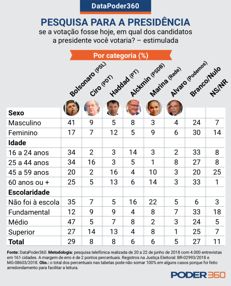 O Poder 360 divulgou ainda uma tabela com os dados estratificados. Entretanto, não sei o que acontece com essa pesquisa, os números não fazem nenhum sentido.