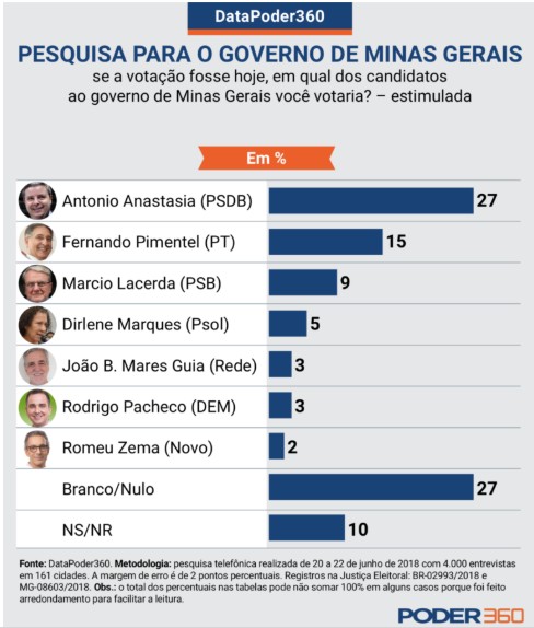 Os números do Poder 360 devem ser cotejados com outras pesquisas em Minas Gerais, como a do Paraná Pesquisas, do final de maio, que mostra o seguinte cenário de intenção de votos.