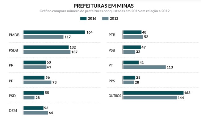 As dificuldades da esquerda em Minas, e particularmente do PT, foram vistas no último desempenho eleitoral do partido no estado, conforme se pode ver pelo infográfico abaixo, feito pelo jornal Estado de Minas. Esse é um dado que é preciso olhar com muita atenção, porque aí não é pesquisa: é a mais recente manifestação das urnas. O PT perdeu 77 prefeituras em 2016. Um verdadeiro massacre.