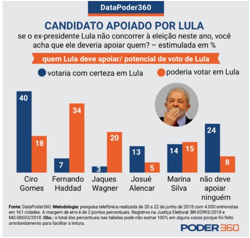Apesar de não ter incluído Lula no cenário eleitoral, o Poder 360 perguntou aos entrevistados qual o candidato o ex-presidente deveria apoiar, no caso de não poder ser candidato.