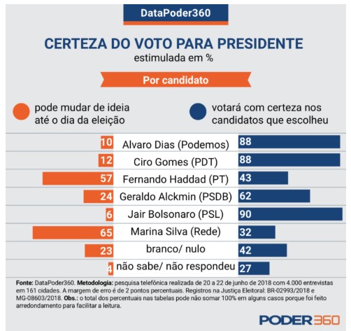 O Poder 360 fez ainda uma pergunta sobre a “certeza do voto” para os candidatos. Essa é uma questão importante para essa pesquisa em particular, porque nos permite avaliar até que ponto as respostas sobre os candidatos foi segura.