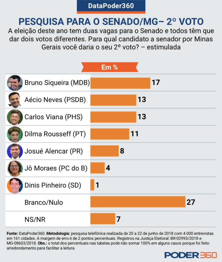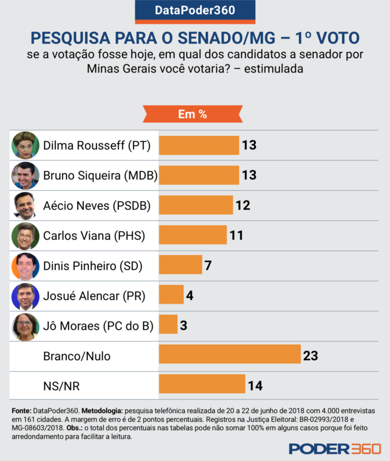 Para o senado, há um empate entre os principais candidatos: Dilma, Bruno Siqueira, Carlos Viana e Aécio Neves. Josué de Alencar também tem boa pontuação.