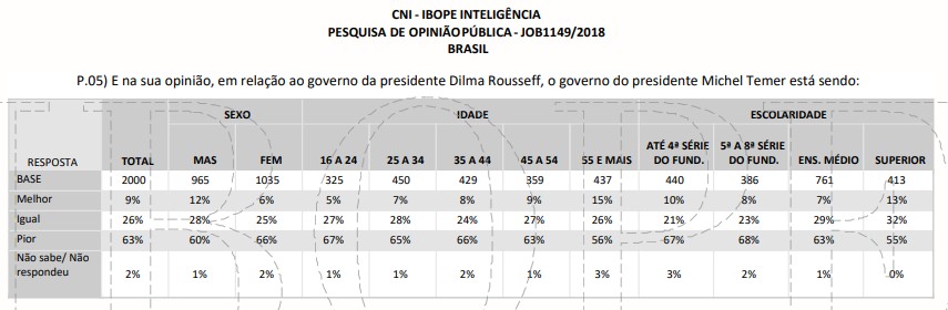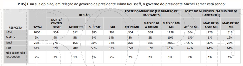 Uma das tabelas traz as respostas se o entrevistado considera a atual administração pior, igual ou melhor que a de Dilma Rousseff.