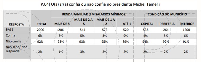 O último Ibope traz a última avaliação do governo Temer. Trata-se do governo mais mal avaliado de todos os tempos. Quiçá não existe exemplo igual em outro lugar do mundo de um presidente tão universalmente desprezado: 92% dos brasileiros, segundo a pesquisa, “não confiam” no presidente Temer.
