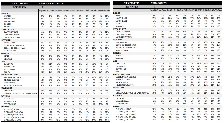 Alckmin apresentou um bom crescimento, atingindo 9% das intenções de voto em cenário com Lula, e 10%, sem Lula. No Sudeste, em cenário sem Lula, o tucano já tem 16%.