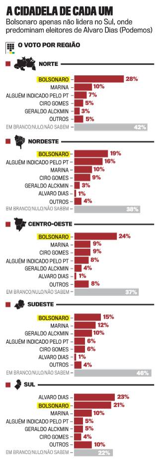 A revista traz um cenário sem Lula mas com um candidato apresentado como “alguém do PT indicado por Lula”.  Neste cenário, Bolsonaro lidera em todas as regiões.