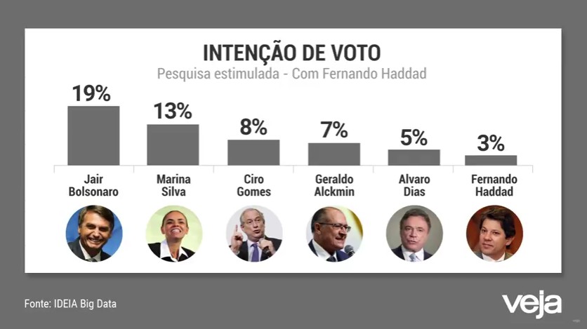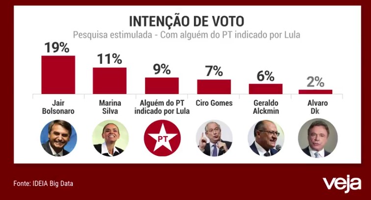 Ideia Big Data: Lula 29%, Bolsonaro 17%, Marina 11%, Ciro 7%, Geraldo 7%