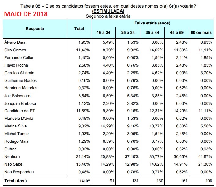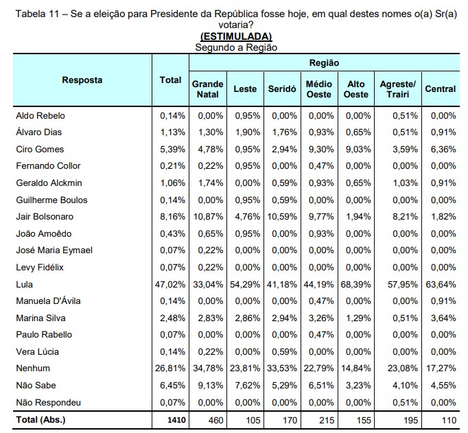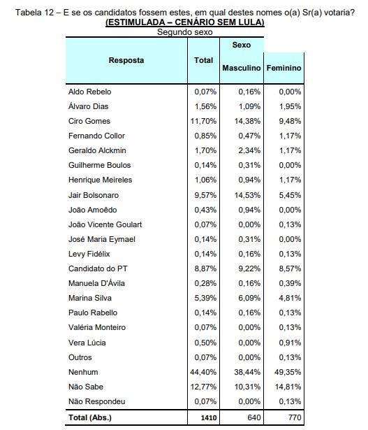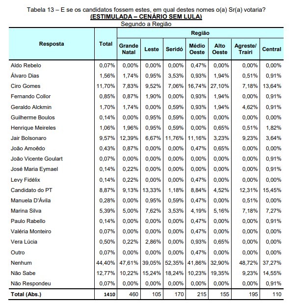 No cenário sem o nome do ex-presidente Luiz Inácio Lula da Silva, Ciro Gomes fica com 11,70%; seguido por Jair Bolsonaro, com 9,57%; e pelo “candidato do PT”, com 8,87%. A pré-candidata Marina Silva tem 5,39%. Álvaro Dias 1,56%, Geraldo Alckmin 1,70% e Henrique Meirelles 1,06%. Na distribuição por região, Ciro Gomes chega a 27,1% no Alto Oeste; Jair Bolsonaro a 11,76%, no Seridó; o Candidato do PT a 15,45% na região Central; e Marina Silva a 7,62% na região Leste.