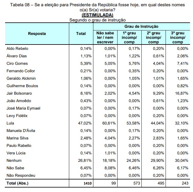 Abaixo, você tem uma tabela com os votos por grau de instrução. Entre eleitores que não sabem ler nem escrever, Lula tem 61% dos votos, e apenas Ciro Gomes e Marina dão alguns sinais de vida, com 5% e 4%, respectivamente; Bolsonaro tem 2% neste segmento do eleitorado.