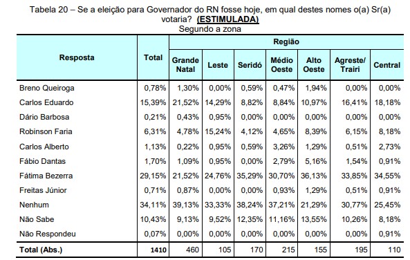 Na distribuição por regiões, o percentual mais expressivo de Fátima Bezerra é no Alto Oeste, onde ela chega a 36,13%. Esta é a região onde o ex-presidente Lula tem o melhor desempenho, com 68,39%. O menor índice da pré-candidata petista é na Grande Natal, com 21,52%. Carlos Eduardo tem o melhor desempenho na Grande Natal, onde vai a 21,52%, e a pior no Seridó, onde fica com 8,82%. Robinson Faria tem o índice mais elevado na região Leste, com 15,24%; e o mais baixo no Seridó, com 4,12%.