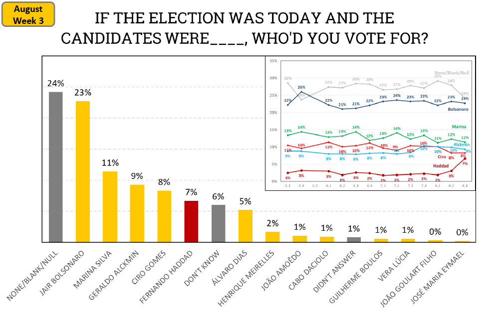 A pesquisa, registrada no TSE (Tribunal Superior Eleitoral) com o código BR-02075/2018, também testou o nome do ex-prefeito de São Paulo Fernando Haddad, vice na chapa encabeçada por Lula, como candidato do PT. Com a possibilidade de o ex-presidente ser barrado pela Lei da Ficha Limpa, Haddad é tido como “plano B” do partido para substituí-lo na disputa até 17 de setembro. Neste cenário, o ex-prefeito aparece com 7% das intenções de voto — crescimento de 4 pontos percentuais em relação à semana anterior. A margem de erro máxima da pesquisa é de 3,2 pontos percentuais para cima ou para baixo. A simulação coloca o deputado Jair Bolsonaro como líder, com 23%, mesmo patamar da semana anterior. Brancos, nulos e indecisos somam 31%, ao passo que Marina, Alckmin, Ciro e Álvaro Dias aparecem novamente em empate técnico, desta vez juntamente com Haddad.