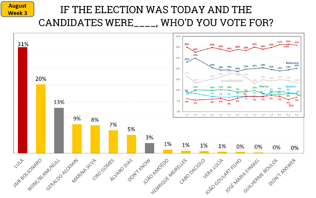 SÃO PAULO – Na semana em que os partidos e coligações registraram seus candidatos para as eleições, o ex-presidente Luiz Inácio Lula da Silva (PT) manteve a liderança no cenário em que seu nome é considerado. É o que mostra pesquisa XP/Ipespe realizada entre 13 e 15 de agosto. Segundo o levantamento, o petista tem 31% das intenções de voto, mantendo seu maior patamar da série histórica, iniciada em 15 maio. Logo atrás aparece o deputado Jair Bolsonaro (PSL), com 20%, seguido por um empate técnico entre Geraldo Alckmin (PSDB), com 9%, Marina Silva (Rede), com 8%, Ciro Gomes (PDT), com 7%, e Álvaro Dias (Podemos), com 5%. Brancos, nulos e indecisos somam 16%. Preso há 4 meses por corrupção passiva e lavagem de dinheiro, Lula é potencialmente inelegível pela Lei da Ficha Limpa e tem baixas chances de participar da disputa.
