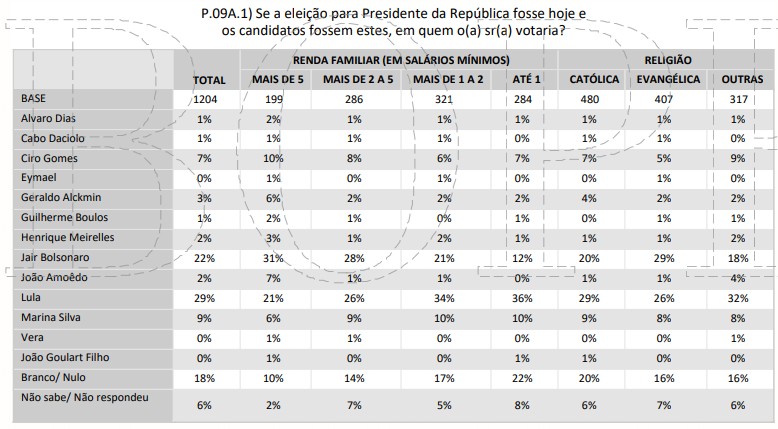 Entre eleitores com renda familiar acima de 5 salários, porém, Lula tem 21% dos votos, contra 31% de Bolsonaro.