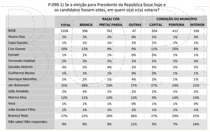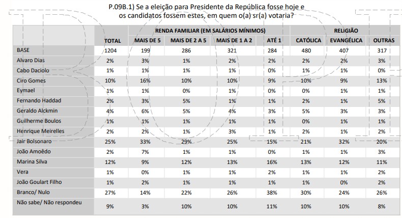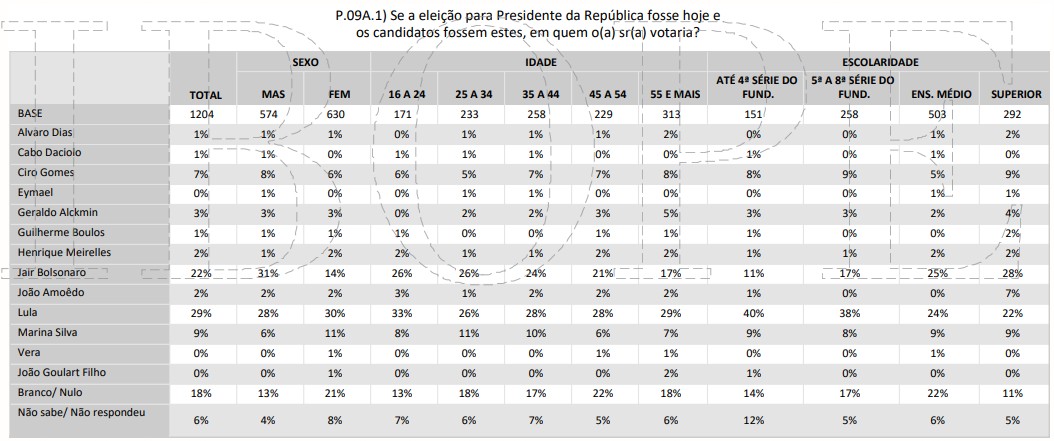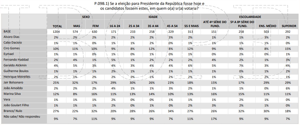 Ciro tem 7% no cenário com a presença do ex-presidente Lula. Entre homens, Ciro tem 8%, acima de Marina, que tem 6%. Entre eleitores que ganham renda familiar superior a 5 salários, o pedetista tem 10%, 4 pontos à frente de Marina. .