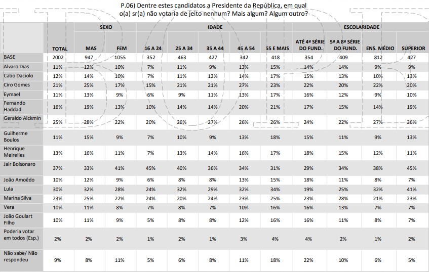 É interessante (e preocupante) notar ainda que Fernando Haddad experimentou um salto de rejeição entre eleitores que ganham mais de 5 salários, naturalmente como resultado da perpepção de que pode ser ele o candidato do PT: em junho, a rejeição desse segmento a Haddad era de apenas 14%, típica de nomes “inofensivos”; hoje pulou para 26%, similar à rejeição de candidatos mais conhecidos, como Geraldo Alckmin (28%) e Ciro Gomes (24%).