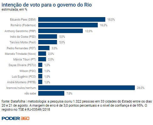 Os lideres estão com patamares baixos. Romário está em queda, já esteve melhor. Tem muito espaço para Tarcísio Mota (Psol) crescer. O PSol tornou-se a segunda força política na capital e em Niterói. Tem um potencial de voto mais alto no estado do que os 5% atuais. O próprio Mota teve 9% nas últimas eleições. Márcia Tiburi também é desconhecida e pode ter pelo menos 10% dos votos só por ter o mesmo número que Lula. Acredito que uma destas duas candidaturas chega ao segundo turno. Ainda está indefinido, mas se eu tivesse que apostar acho que dará Mota x Paes.