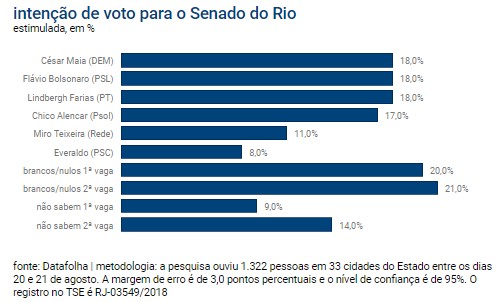 No senado, os três líderes seguem empatados: Cesar Maia, Lindbergh Farias e Flavio Bolsonaro.