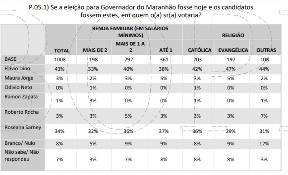 - Entre eleitores que ganham mais de 2 salários, que integram setores sociais com um pouco mais de mobilidade, Flavio Dino tem 53% da preferência, ou 57% dos votos válidos.