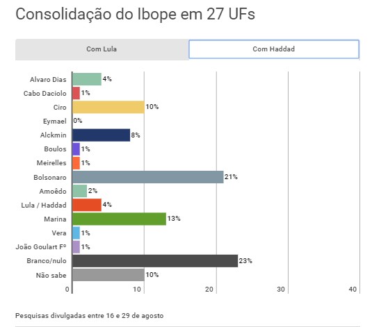 Se os analistas damos essa situação de barato, para grande parte do eleitorado ela não é nada óbvia. No cenário em que o Ibope testou Haddad no lugar de Lula, o eleitorado sem candidato saltou 14 pontos na média ponderada das 27 pesquisas. A cada três eleitores, um não sabe em quem votar, diz que anulará ou votará em branco se o líder das pesquisas ficar fora do páreo. Mas essa média tem os pés na geladeira e a cabeça no forno.