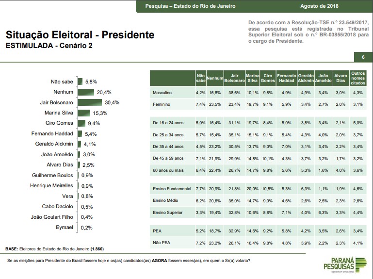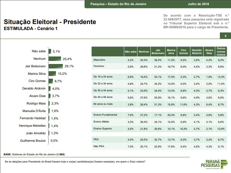 O Paraná Pesquisas divulgou ontem sondagem de intenção de voto para presidente no Rio de Janeiro. A última pesquisa no Rio foi feita em julho.