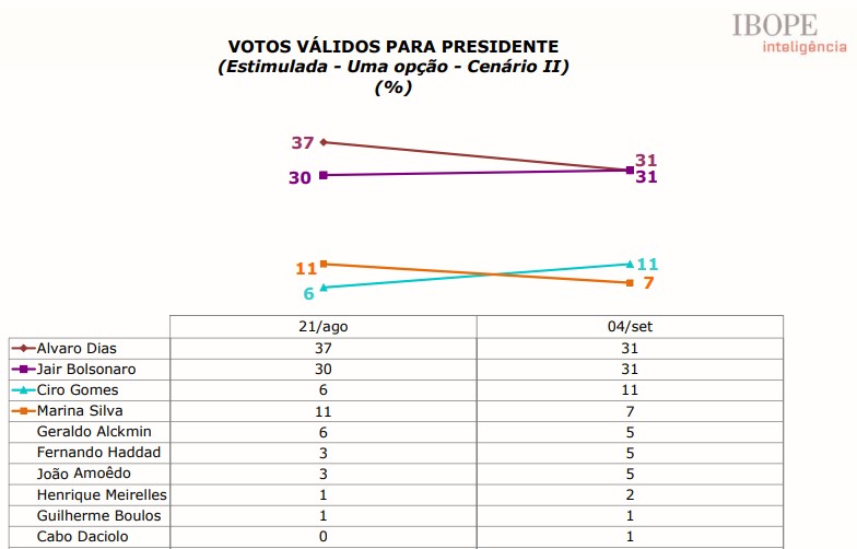 Alvaro Dias também caiu: tinha 22% em agosto, e agora tem 14%.